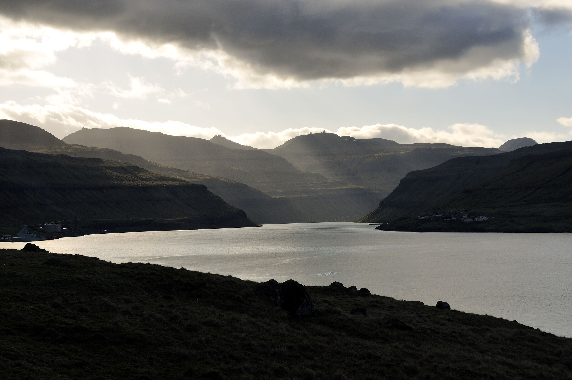 Der Kaldbaksfjordr im Abendlicht.Im Hintergrund die Nato-Radarstation auf dem Berg Sornfelli, links das Elektrizitätswerk bei Sund an der Küstenstraße Nr.50, rechts der Ort