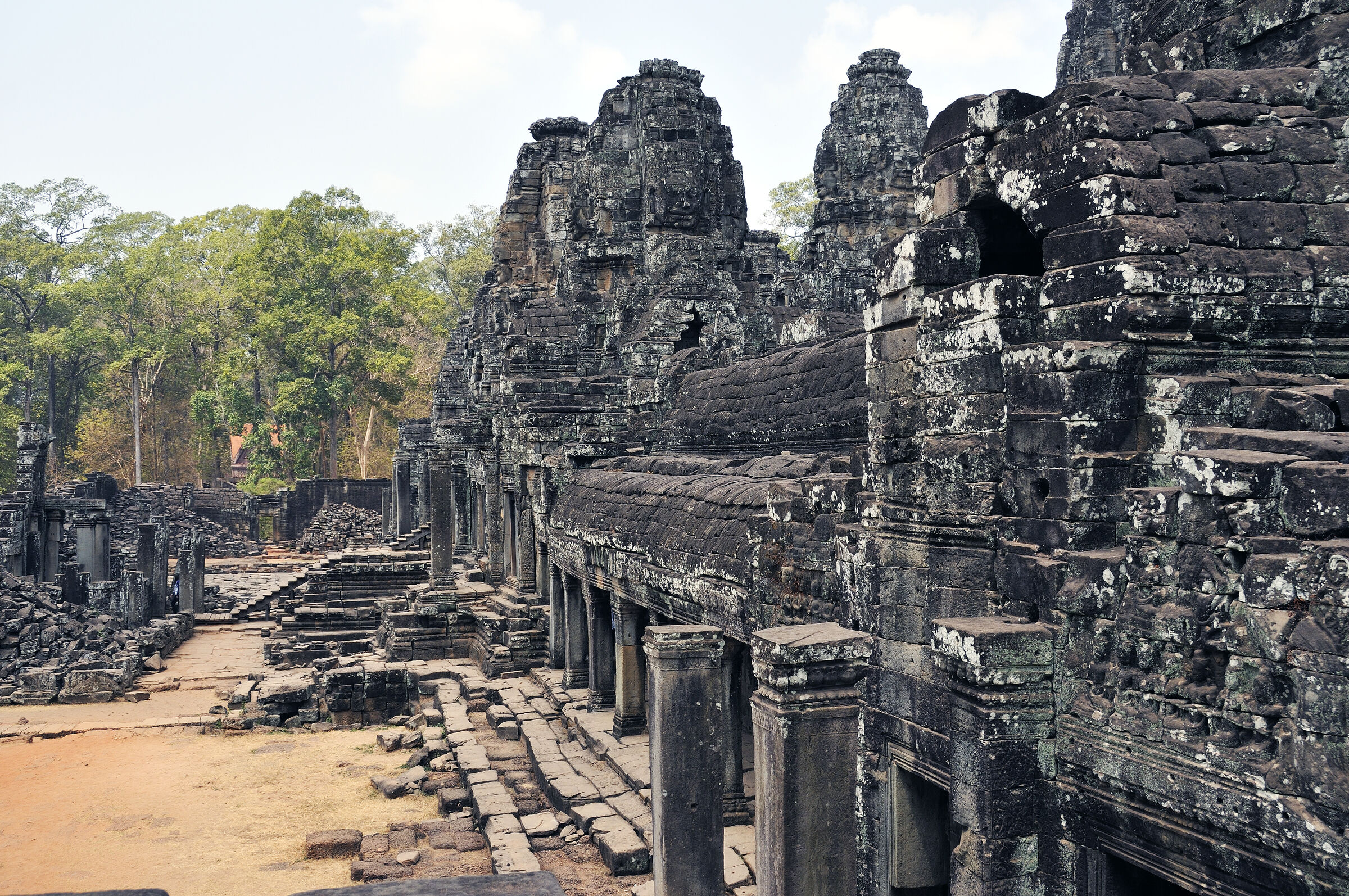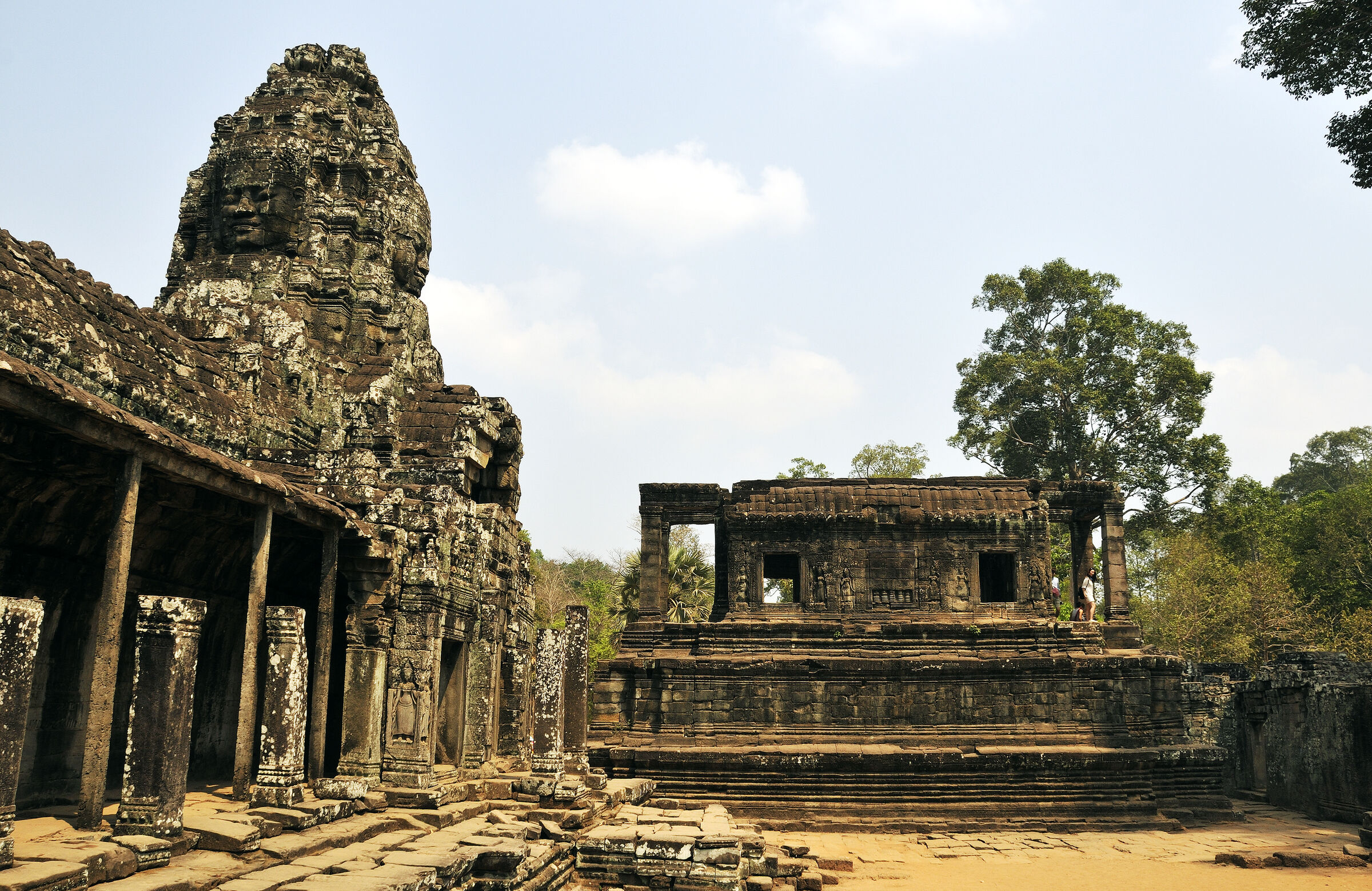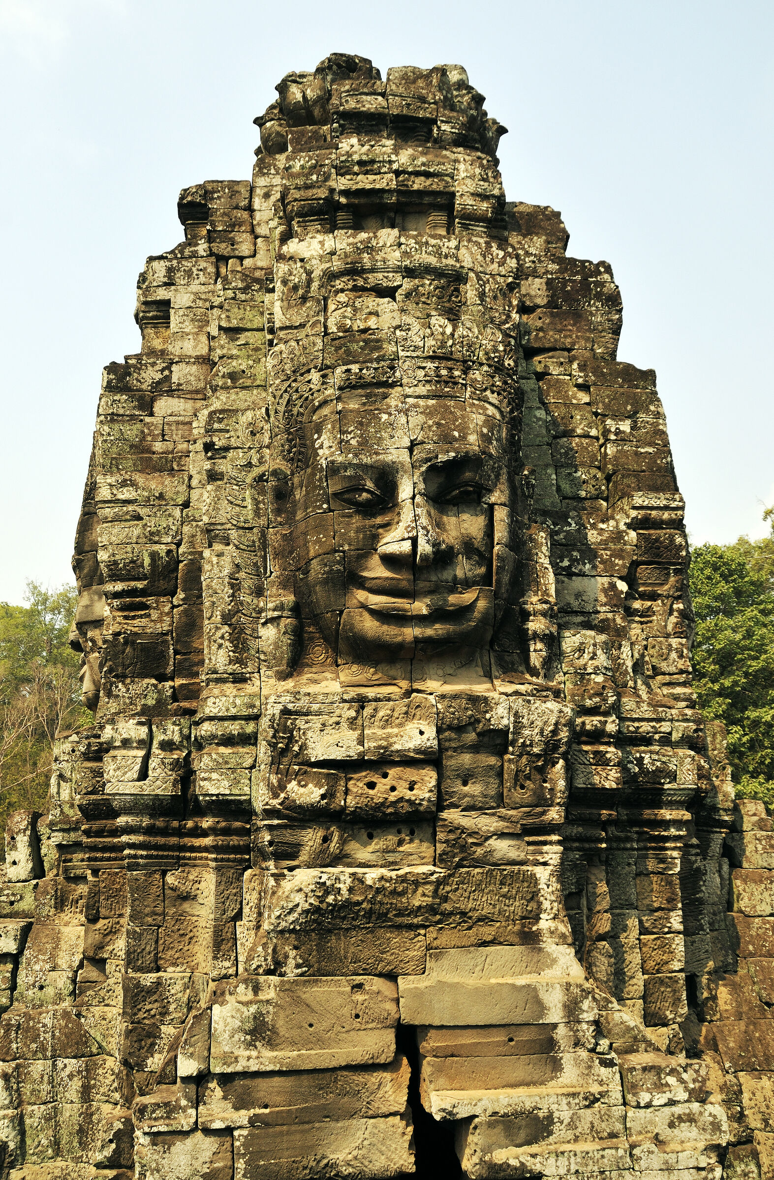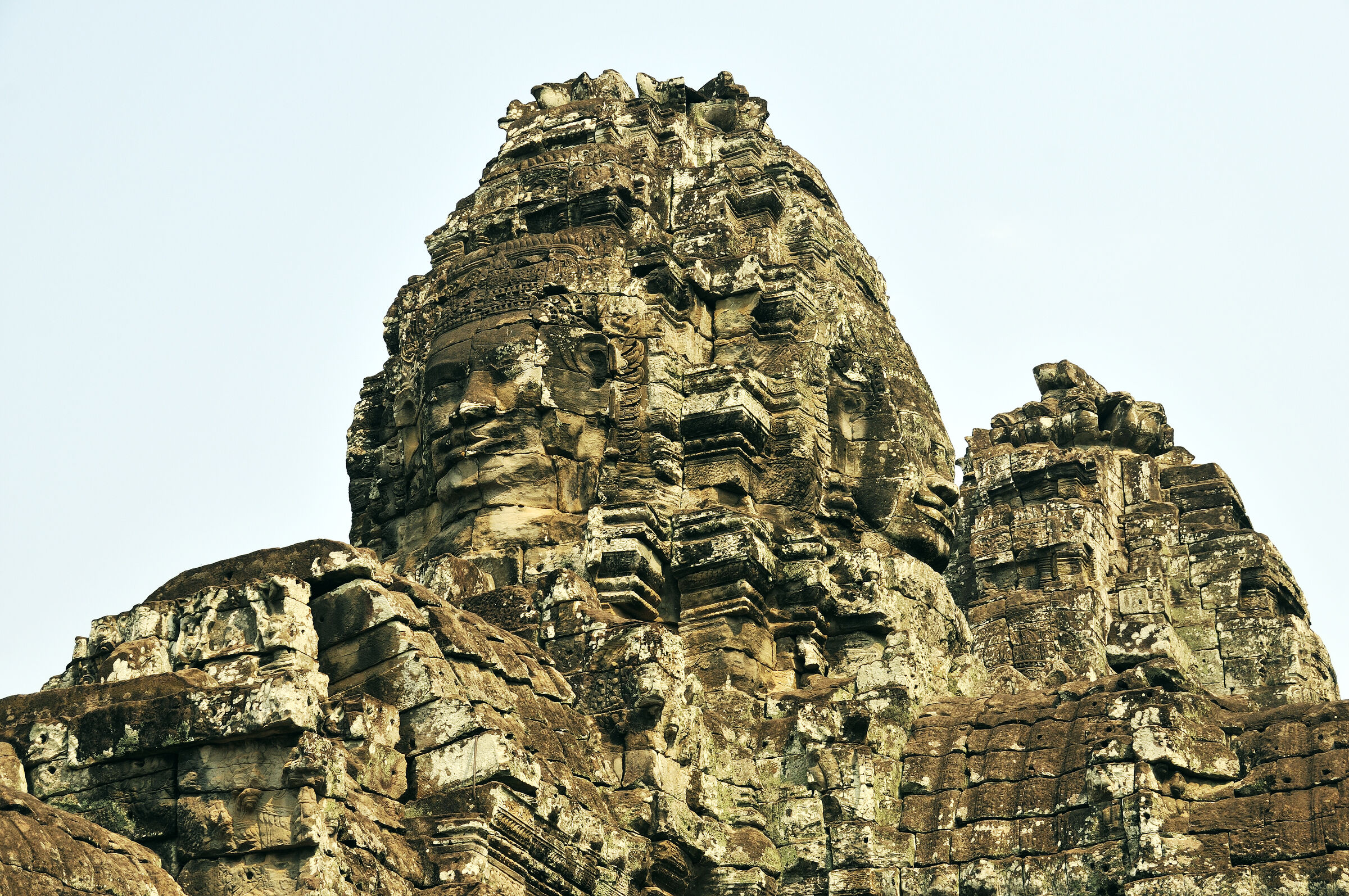 Der Bayon Tempel lag zentral in der damaligen Hauptstadt des Khmerreichs Angkor Thom und war der Haupttempel. Berühmt ist die Anlage wegen der meterhohen lächelnden Steingesichtern des Bodhisattva Lokeshvara an den Türmen. Die Khmer waren zur damaligen Zeit Anhänger sowohl des Hinduismus als auch des Buddhismus. Das zentrale Heiligtum des Tempels war dem Buddha geweiht.