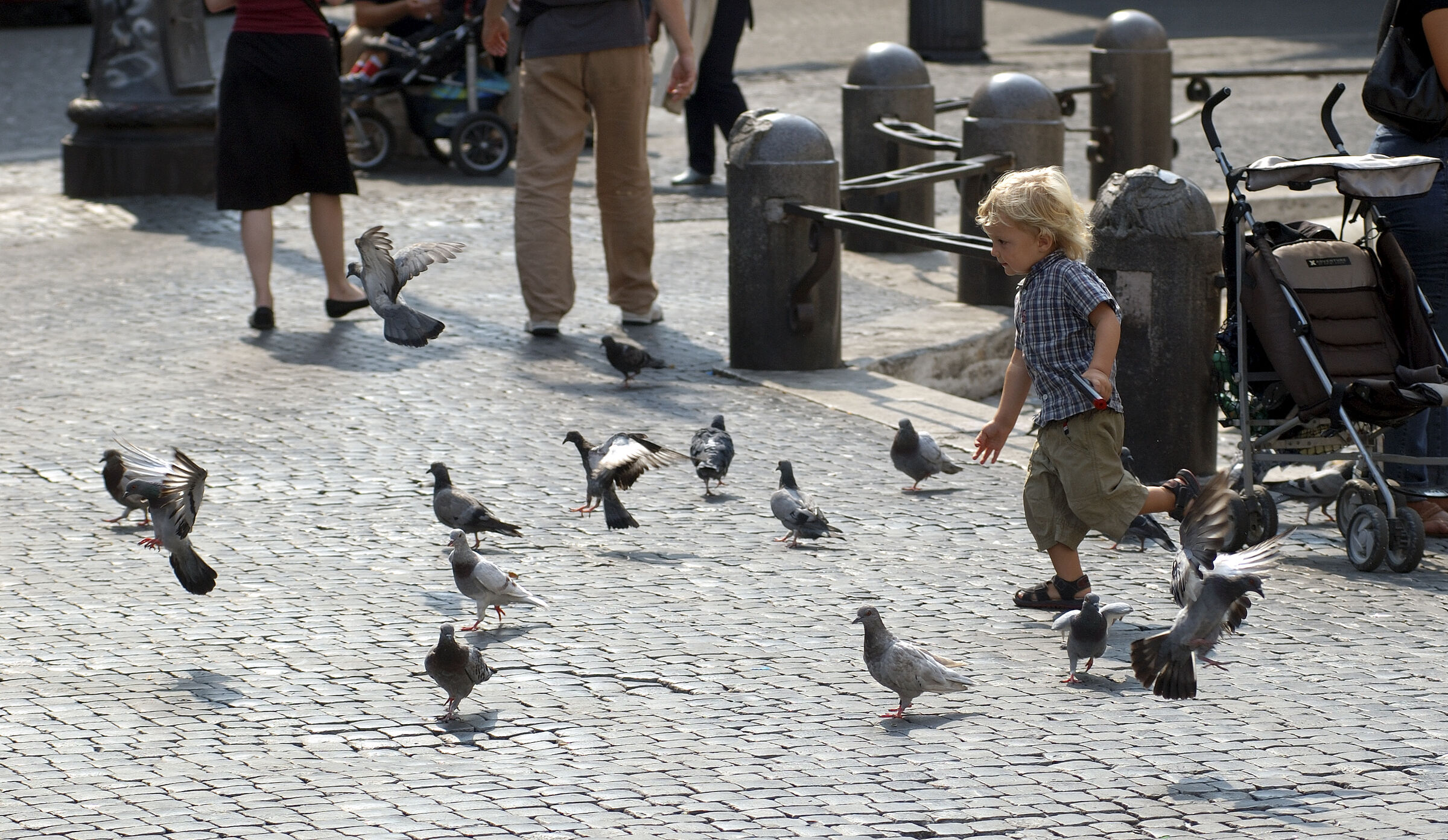 Ein spielendes Kind jagt Tauben auf dem Platz Piazza Navonna im Centro Storico, im „Historischen Zentrum“.
