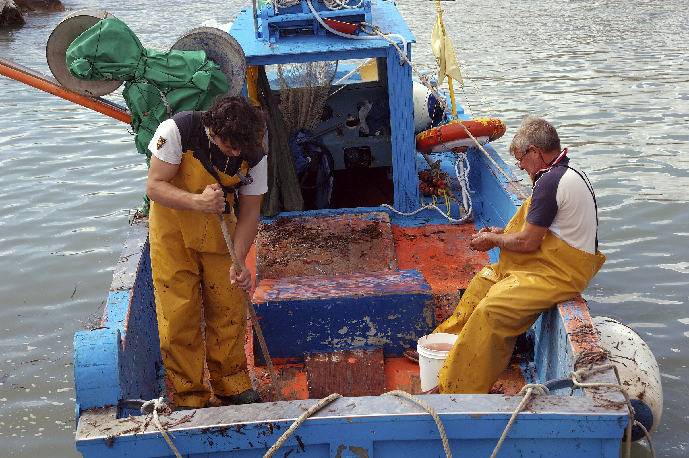 Fischer beim säubern ihres Bootes und beim ausnehmen der Fische im Hafen Otranto. Apulien; Italien